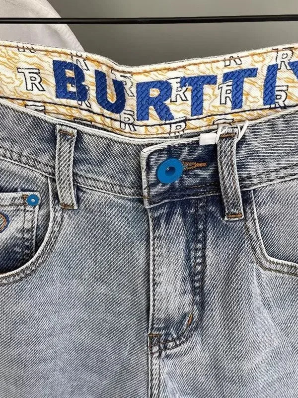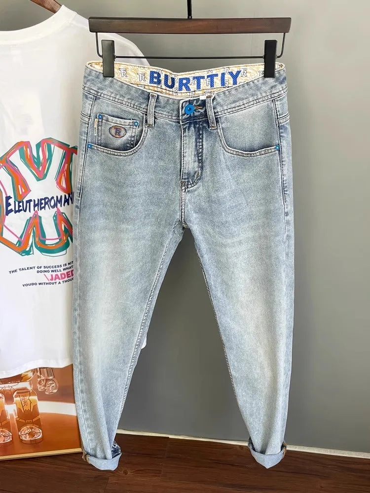 Men’s Embroidered Slim Fit Jeans – Light Blue Summer Straight-Leg Casual Pants (Cropped Length)